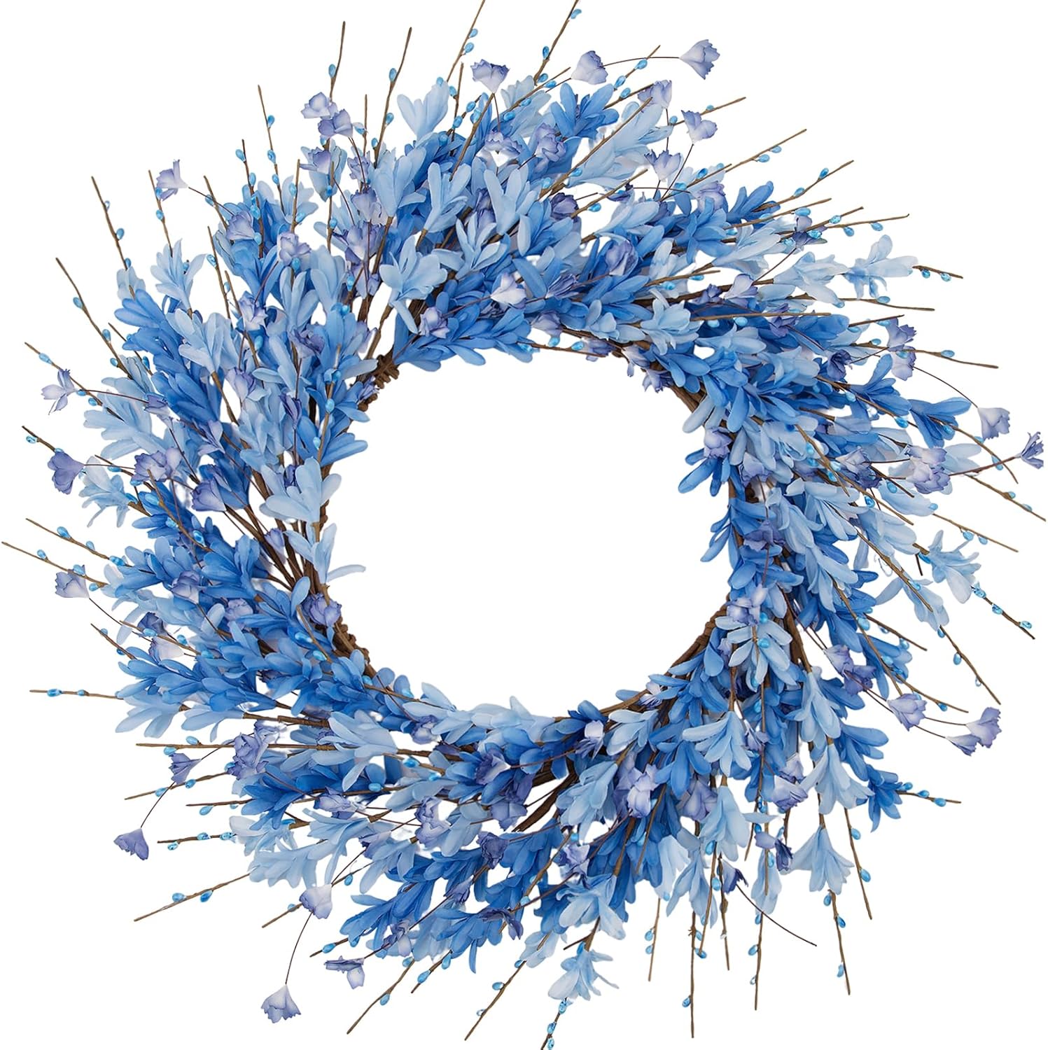This meticulously designed 24-inch artificial forsythia wreath is crafted from high-quality silk-feel petals and hand-made paper flowers, offering exquisite craftsmanship and a realistic appearance for year-round decorative appeal. Its full floral shape and lush foliage create a natural sense of abundance, requiring only simple arrangement to achieve perfect form. Made with weather-resistant materials, the wreath is suitable for both indoor decoration and sheltered outdoor spaces. Whether hung on a porch, front door, or displayed on a living room wall, window, or mantel, it instantly enhances the atmosphere and creates a warm, welcoming ambiance. We offer a variety of elegant color options: Romantic Pink, Classic White, Serene Blue, and Regal Purple. Each hue complements different seasonal themes and home decor styles. From spring renewal and summer parties to autumn harvest and winter festivities, this wreath seamlessly integrates into any setting and can be easily personalized with ribbons, string lights, or other decorative accents. The product is packaged in an eco-friendly compact box to ensure safe delivery. Upon arrival, simply unfold and adjust the wreath to reveal a beautiful, full 24-inch display in just minutes. It requires no maintenance, retains its vibrant colors over time, and makes an ideal gift for loved ones or a charming addition to your own home decor, bringing vitality and beauty to your space throughout the year.