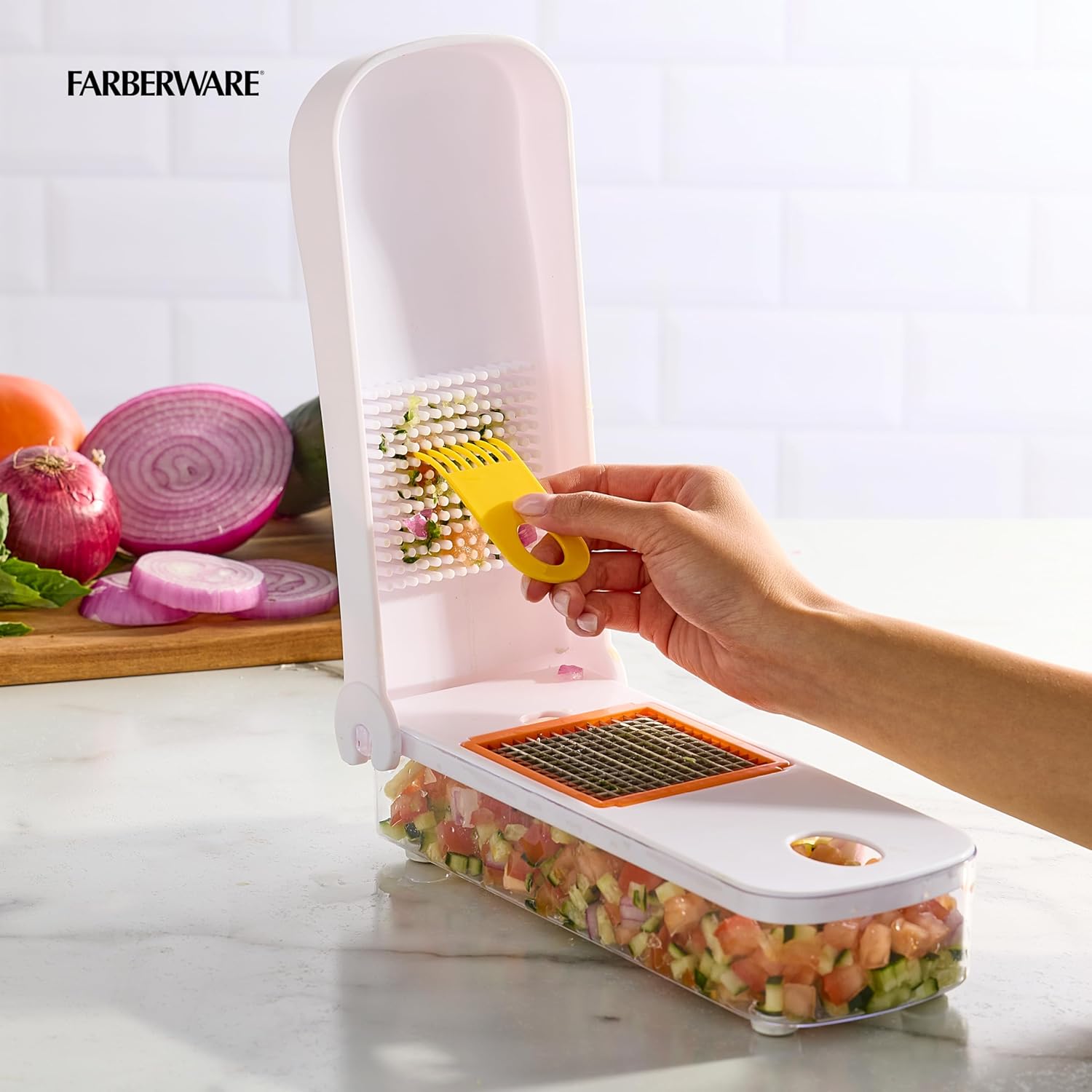 Effortlessly dice potatoes, tomatoes, peppers, cheese, and more in seconds with this Farberware Pro Vegetable Chopper. This handy tool is made from sturdy, BPA-free materials with razor-sharp, cutlery-grade, rust-resistant, stainless steel blades that stand up to daily use. The blades feature grooves that help prevent food from sticking to them, and the cleaning pick is great for removing any pieces that get left behind. The oversized, soft-touch handle and pusher create a secure grip, while the nonslip feet keep the chopper in place for safe, easy slicing. Plus, the blades and cleaning pick conveniently fit inside the chopper for simple, neat storage in drawers and cabinets. Includes a medium dicing blade and a small dicing blade. Hand wash only.